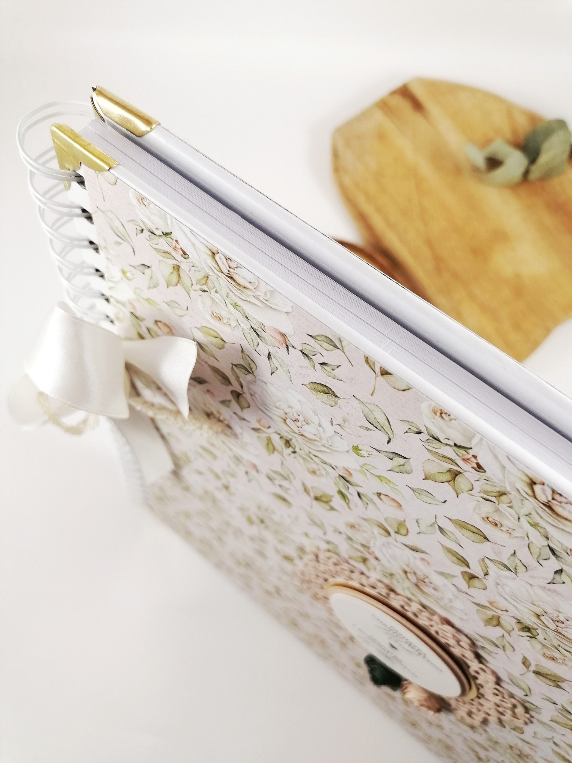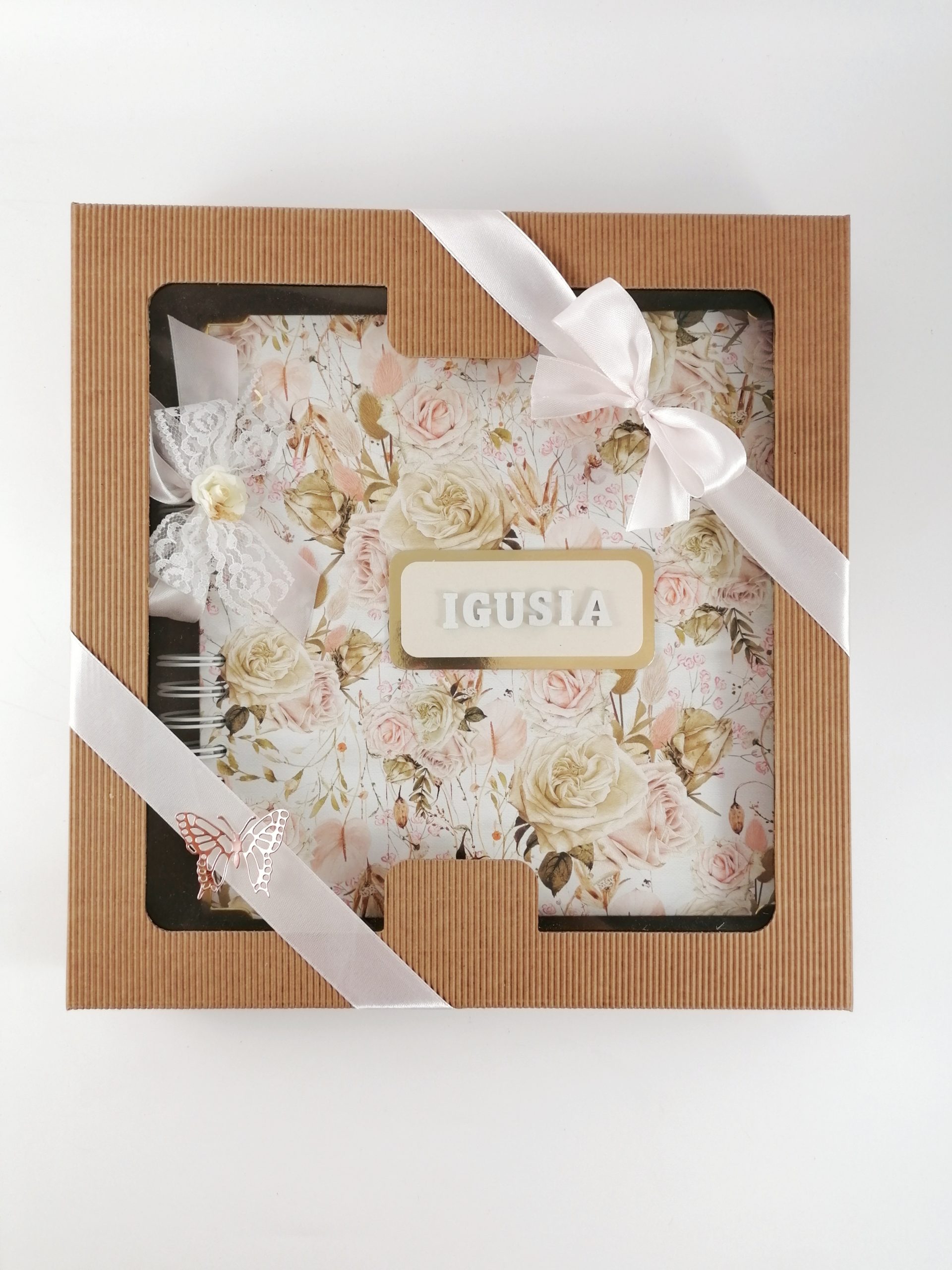 Okładka wykonana z tektury o grubości 1,5 mm przyozdobiona grafiką z dowolnym motywem graficznym, imieniem dziecka z literek, ręcznie wycinanymi dodatkami oraz kokardą. Album zbindowany jest białą spiralą o średnicy 1,25 cm.