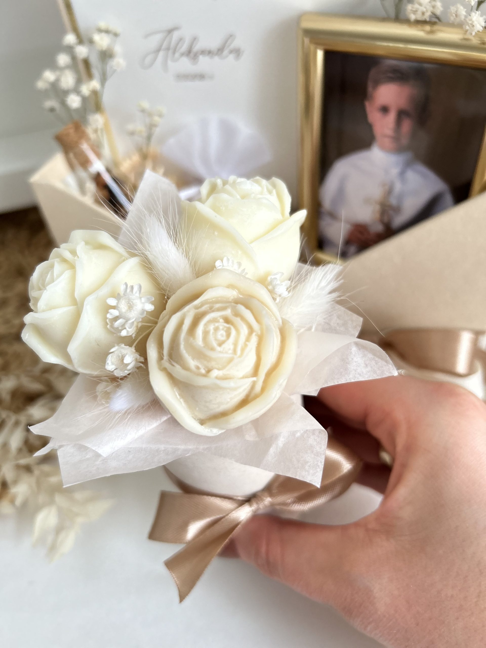 – mini flowerbox z woskowych kwiatów, ozdobiony welurem i wstążeczką