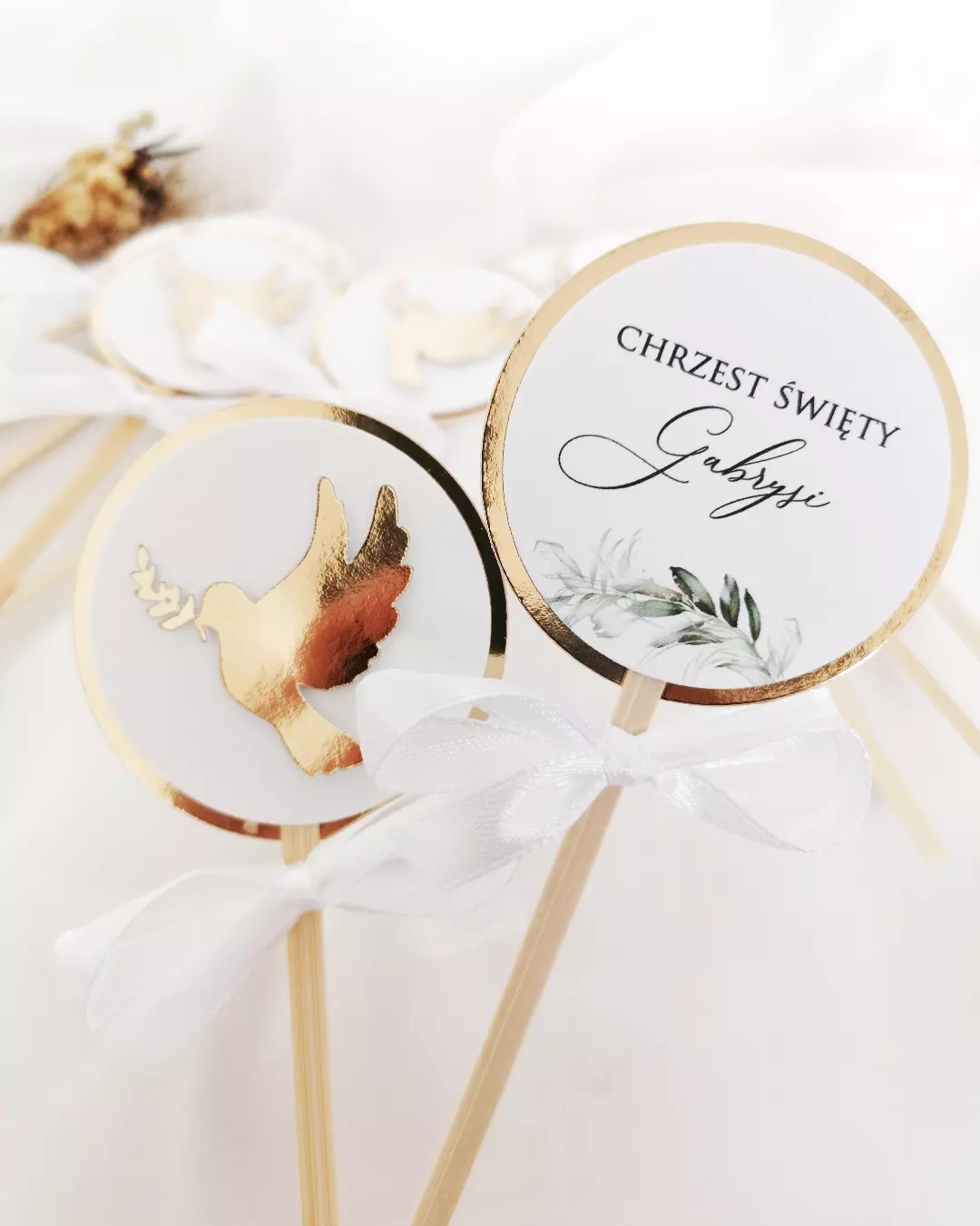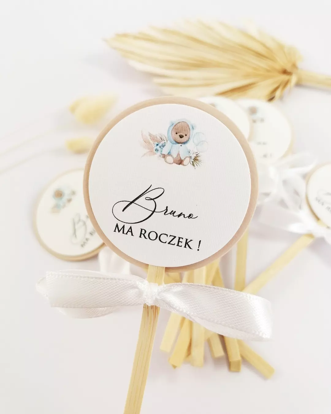 Cena zawiera podklejkę w dowolnym kolorze, kółeczko z napisem i dowolną grafiką lub element wycinany. Każdy topperek ozdobiony jest wstążką w dowolnym kolorze.