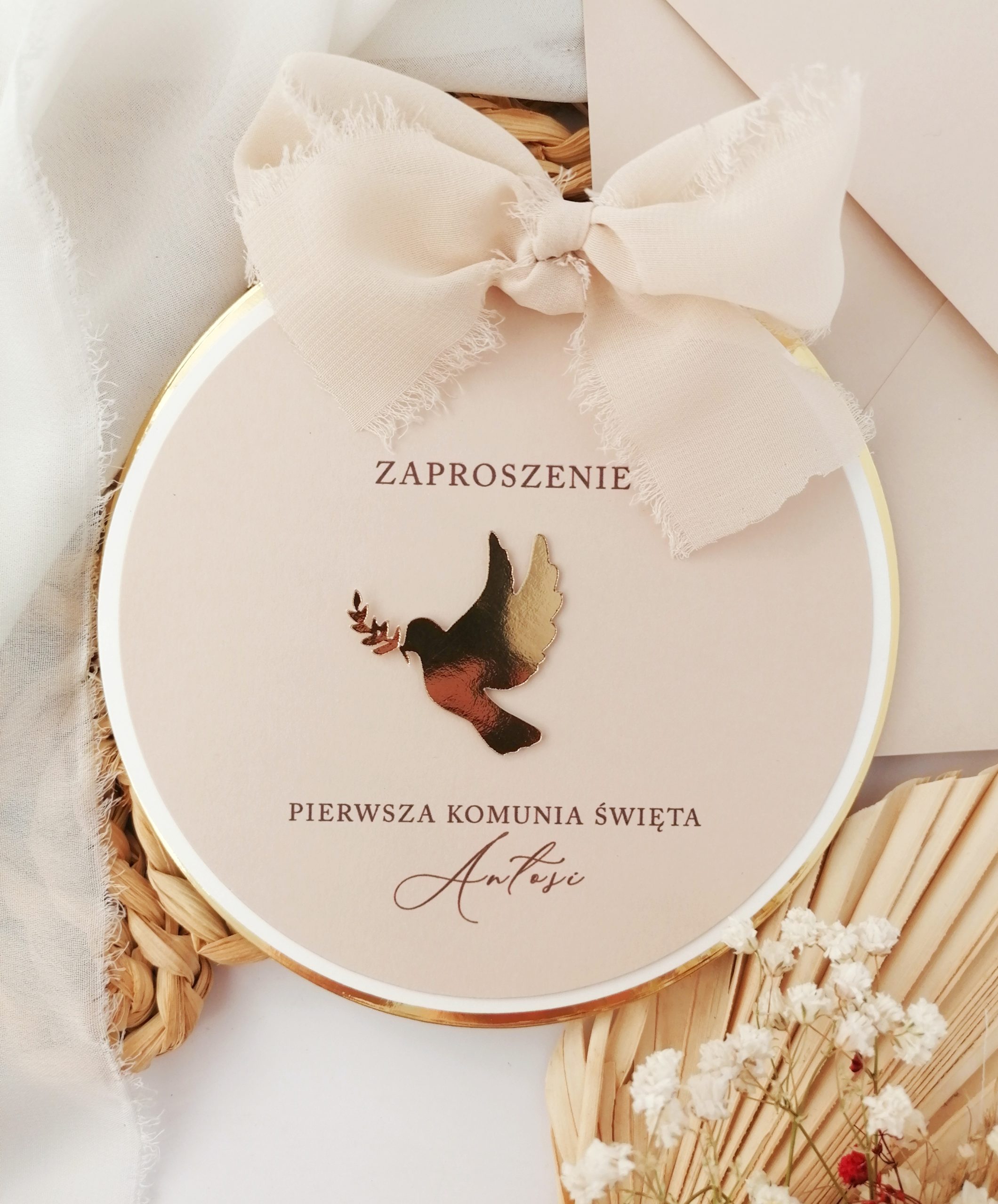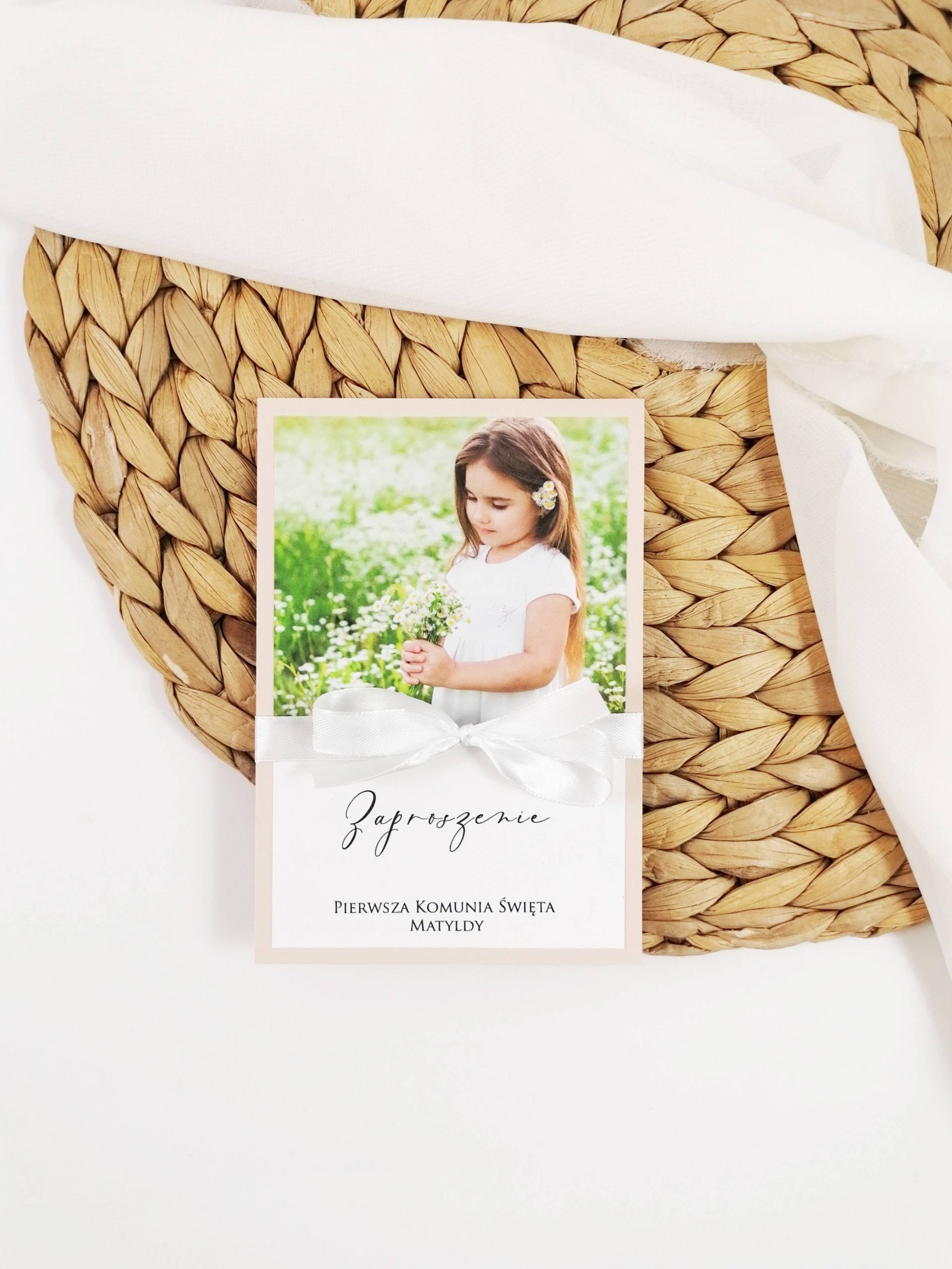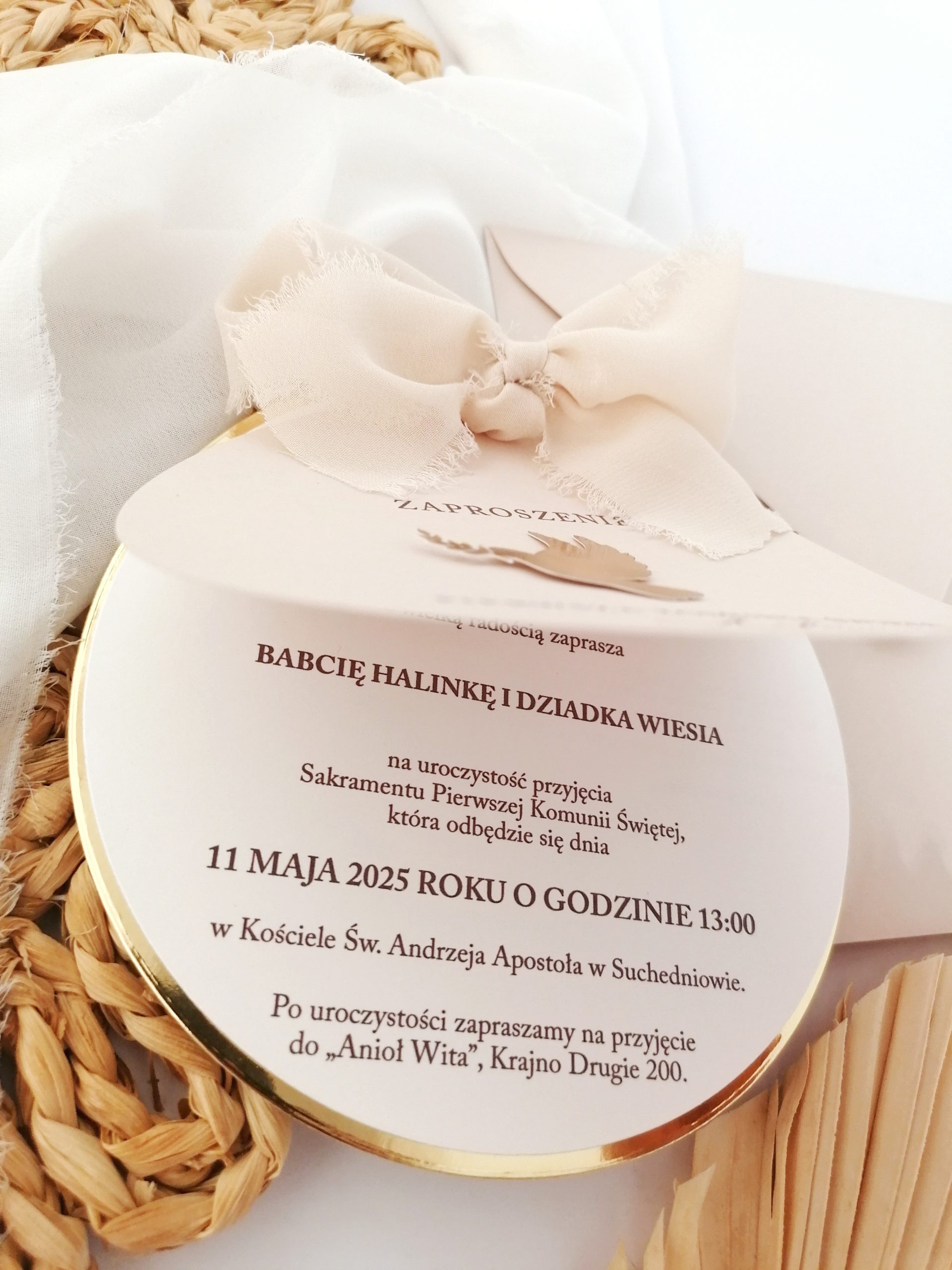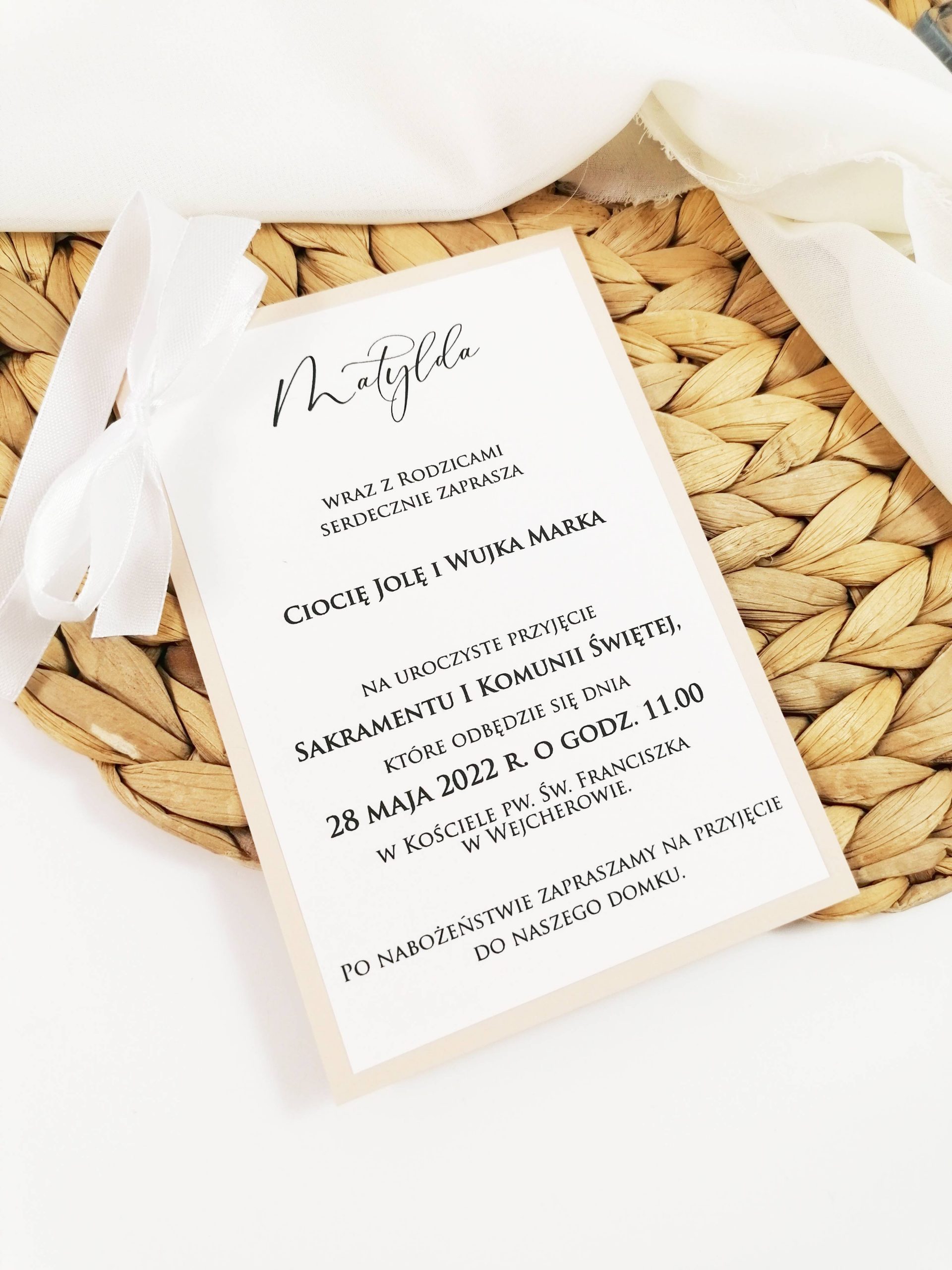 Zaproszenie ozdobione wstążką w dowolnym kolorze i kółeczkiem.
