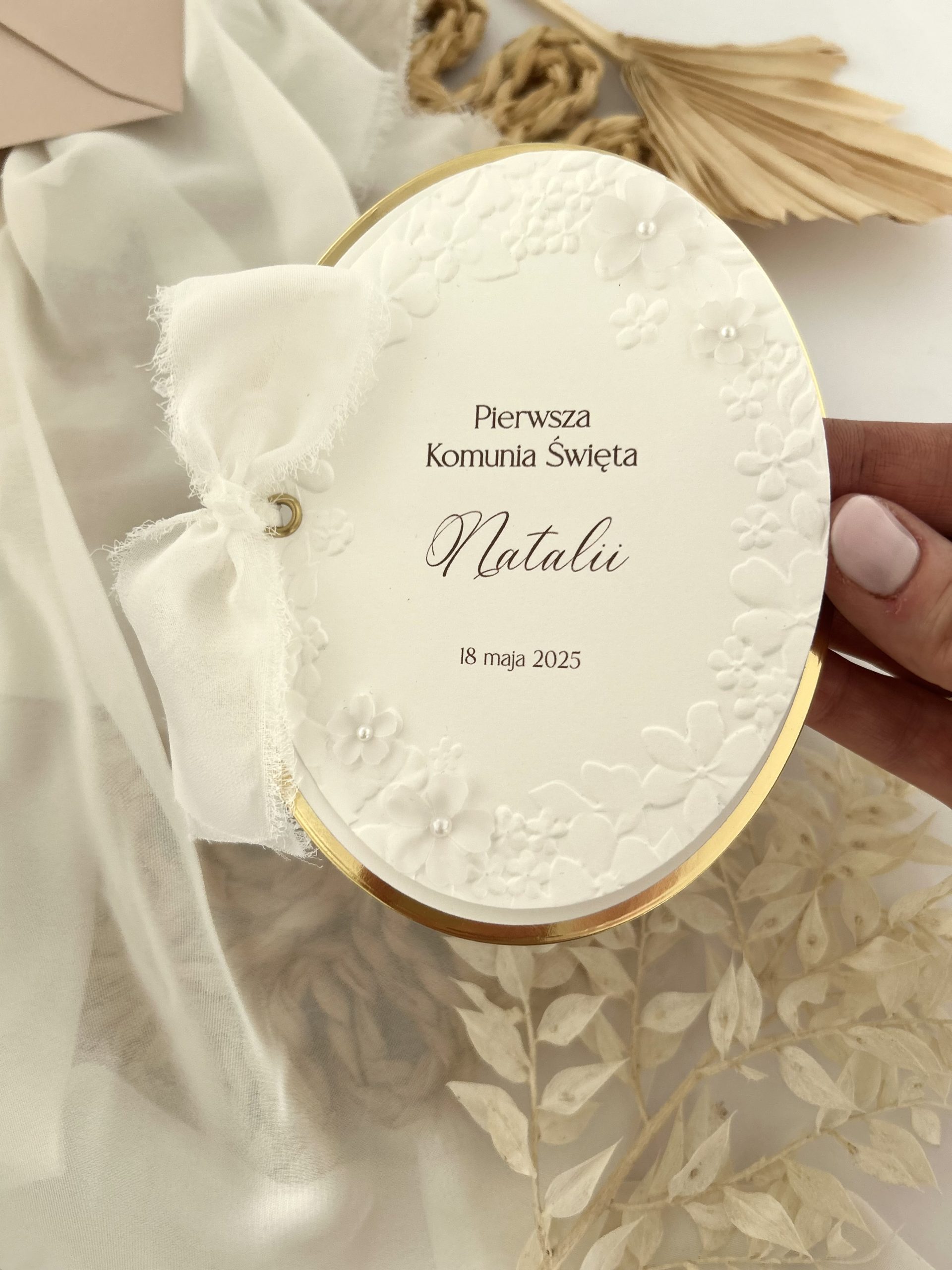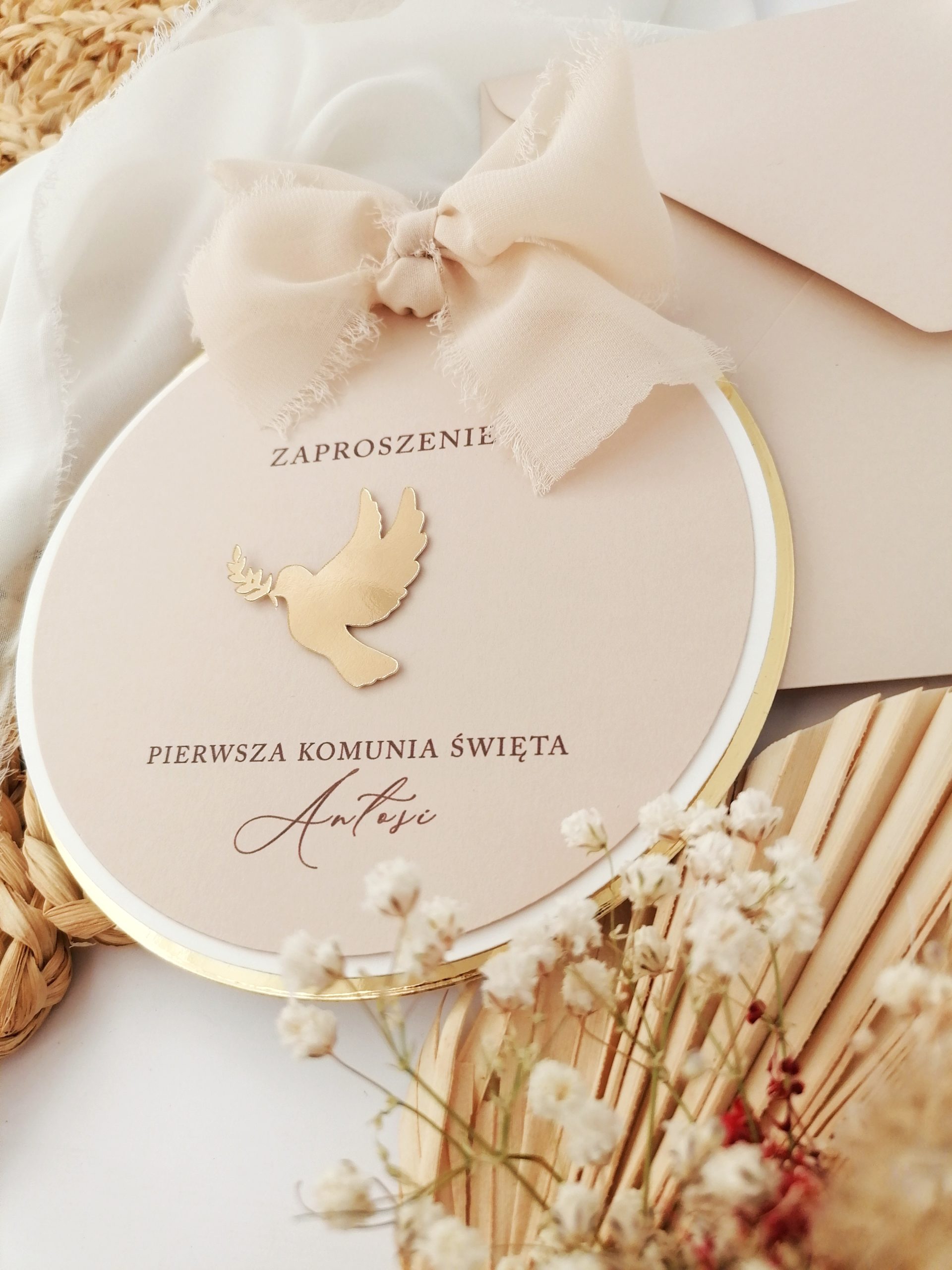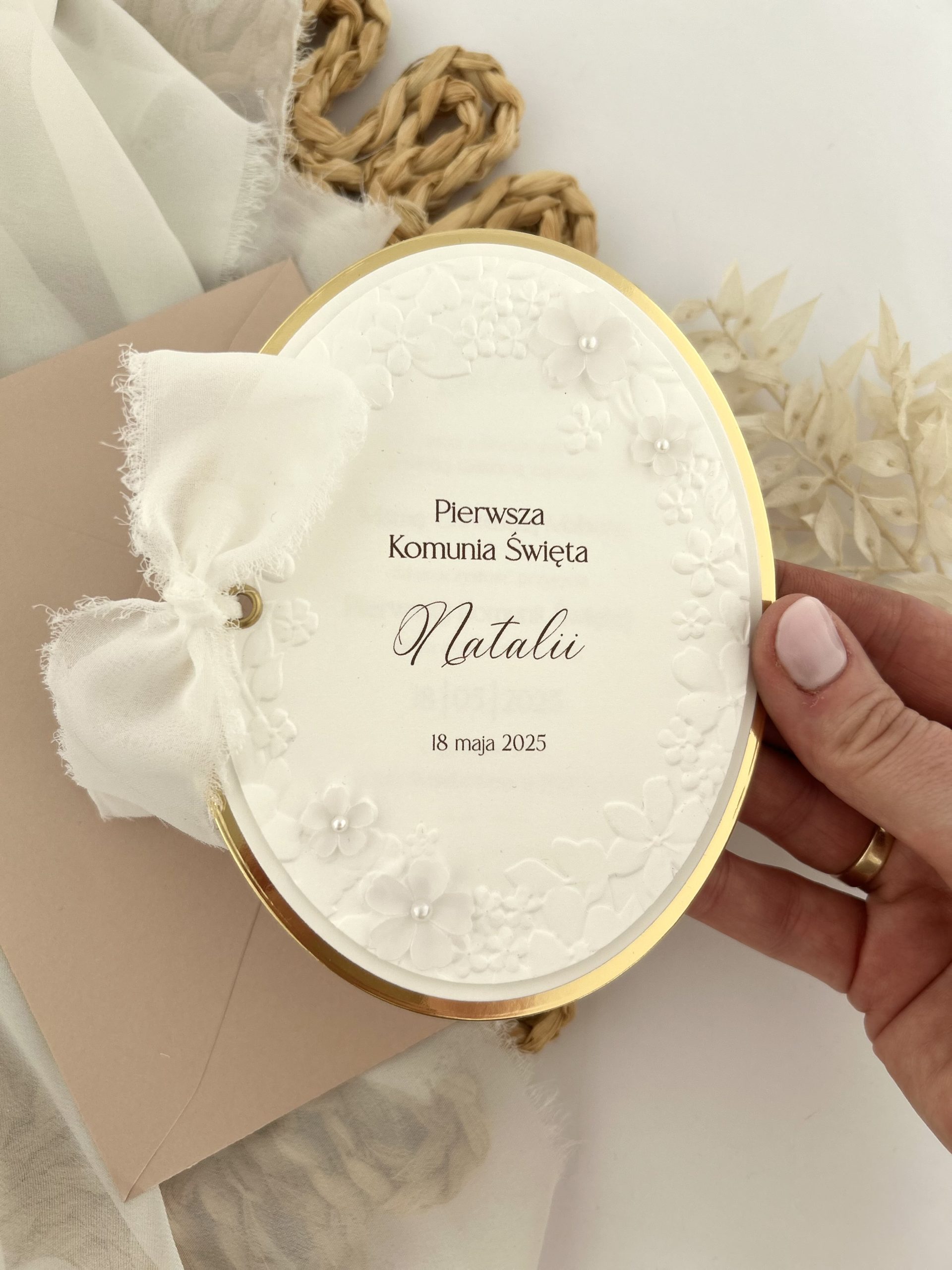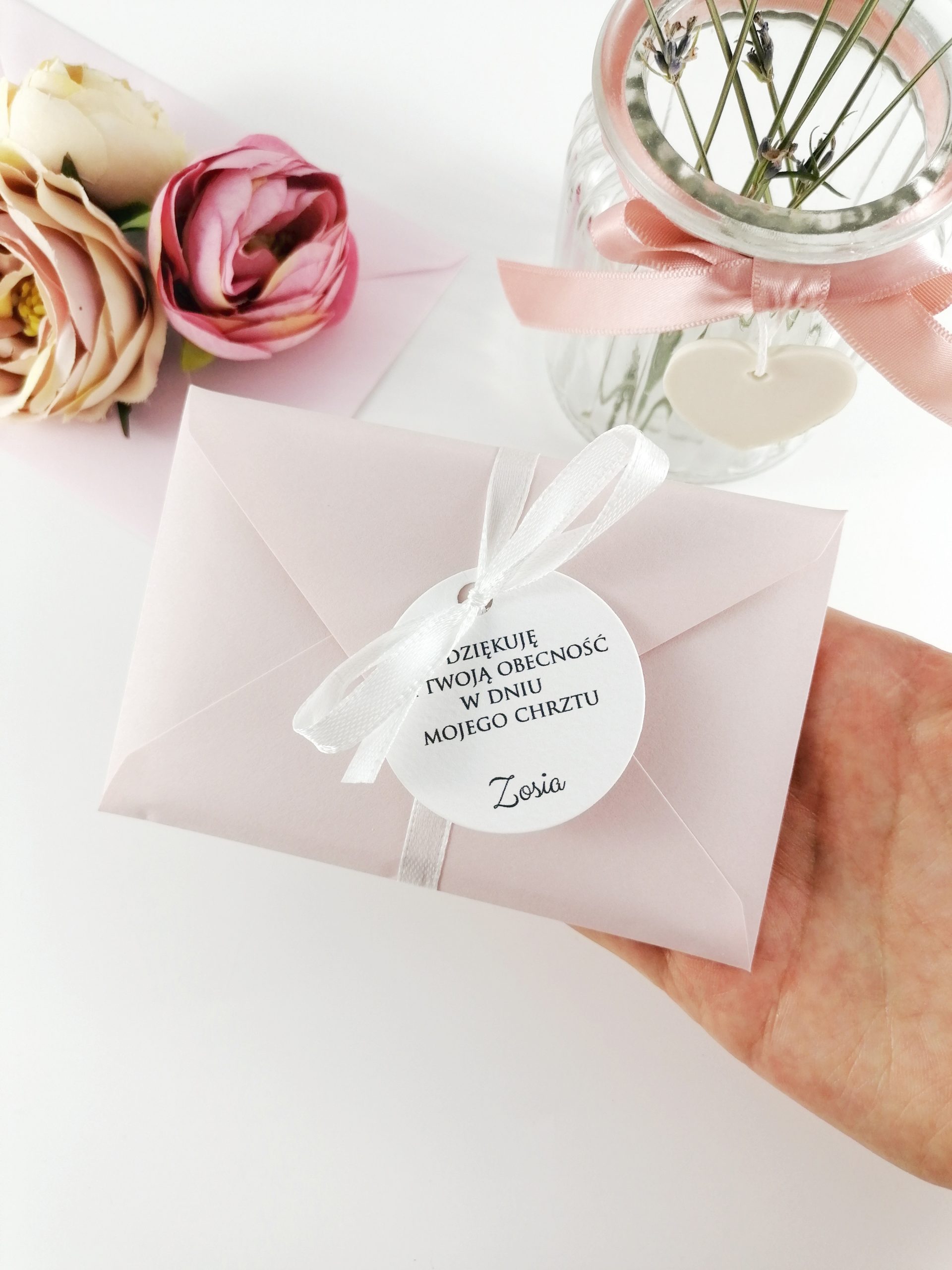 Zaproszenie ozdobione wstążką w dowolnym kolorze i kółeczkiem.