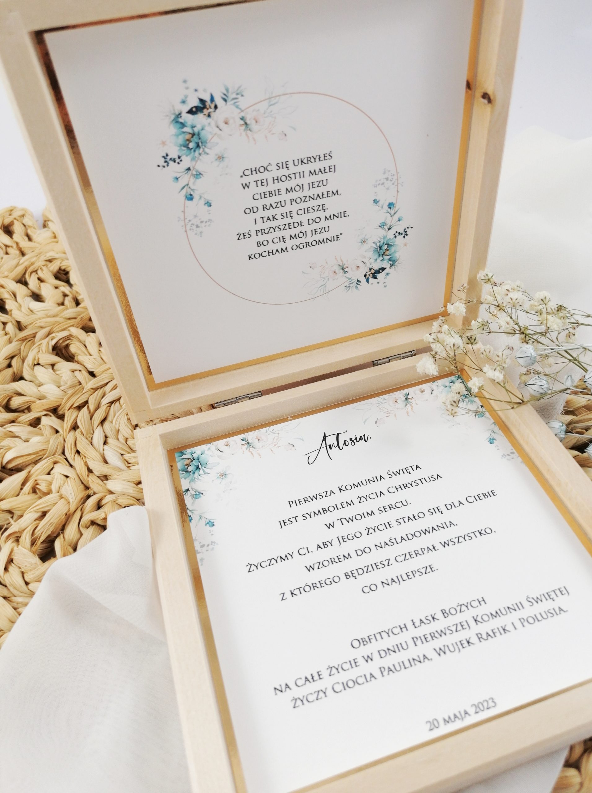 Drewniane pudełeczko w rozmiarze 15 cm x 15 cm, dowolnie przyozdobione wraz z wydrukowaniem dowolnych podziękowań oraz zdjęcia lub cytatu.