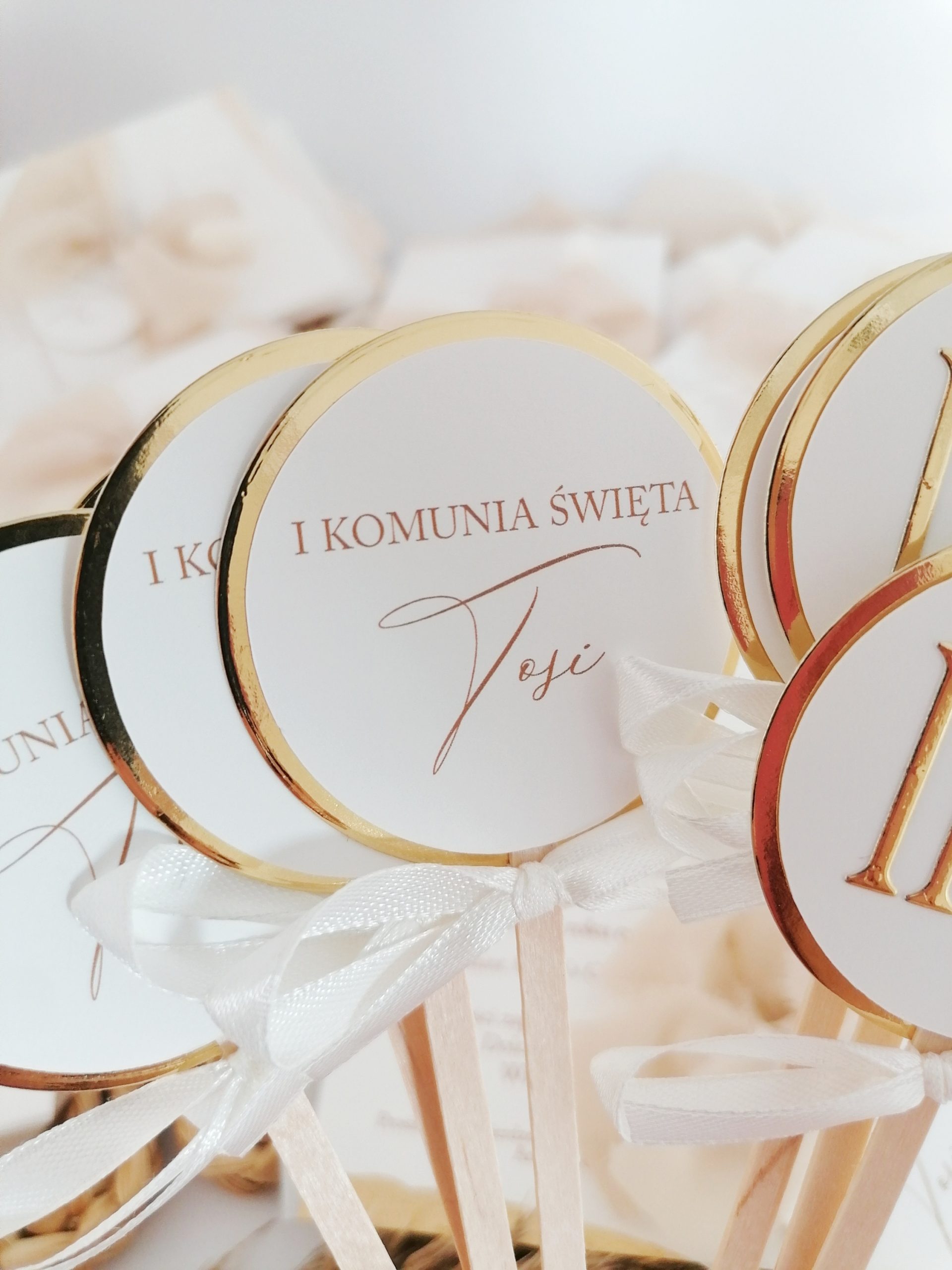 Cena zawiera podklejkę w dowolnym kolorze, kółeczko z napisem i dowolną grafiką lub element wycinany. Każdy topperek ozdobiony jest wstążką w dowolnym kolorze.