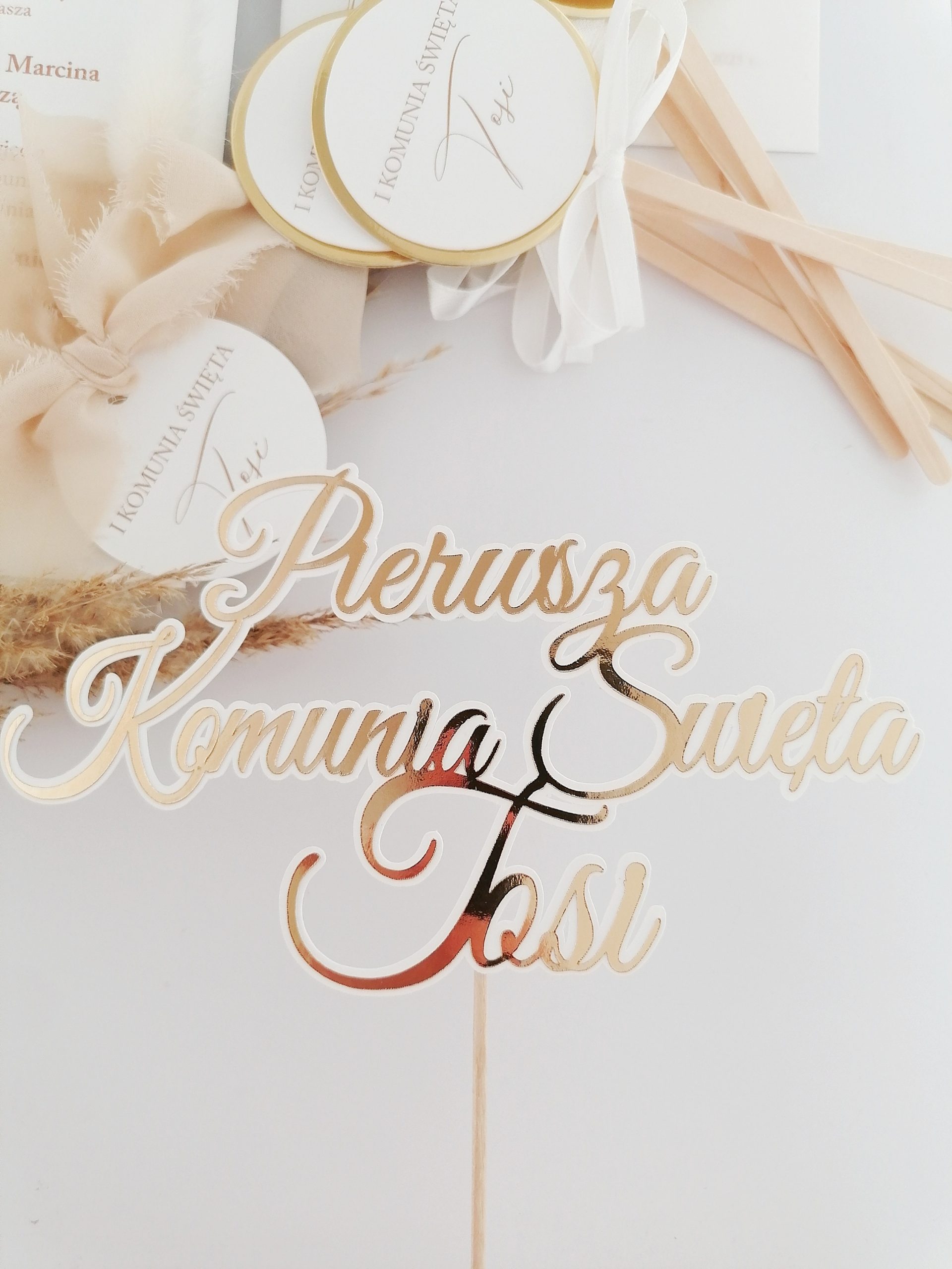 Topper papierowy w rozmiarze ok. 15 cm szerokości lub inny dowolny rozmiar. Dowolny napis. Kolor lustrzane złoto.