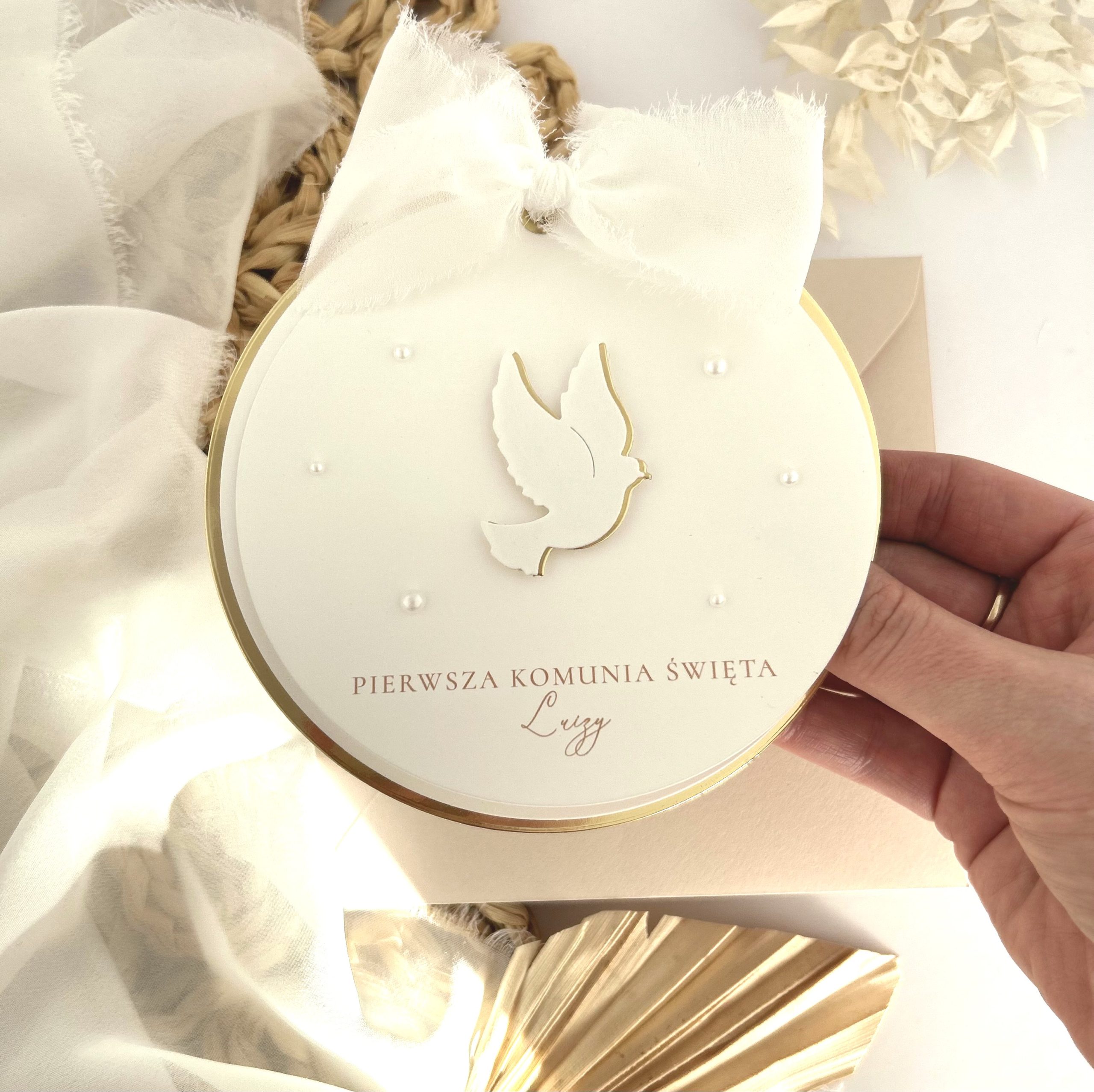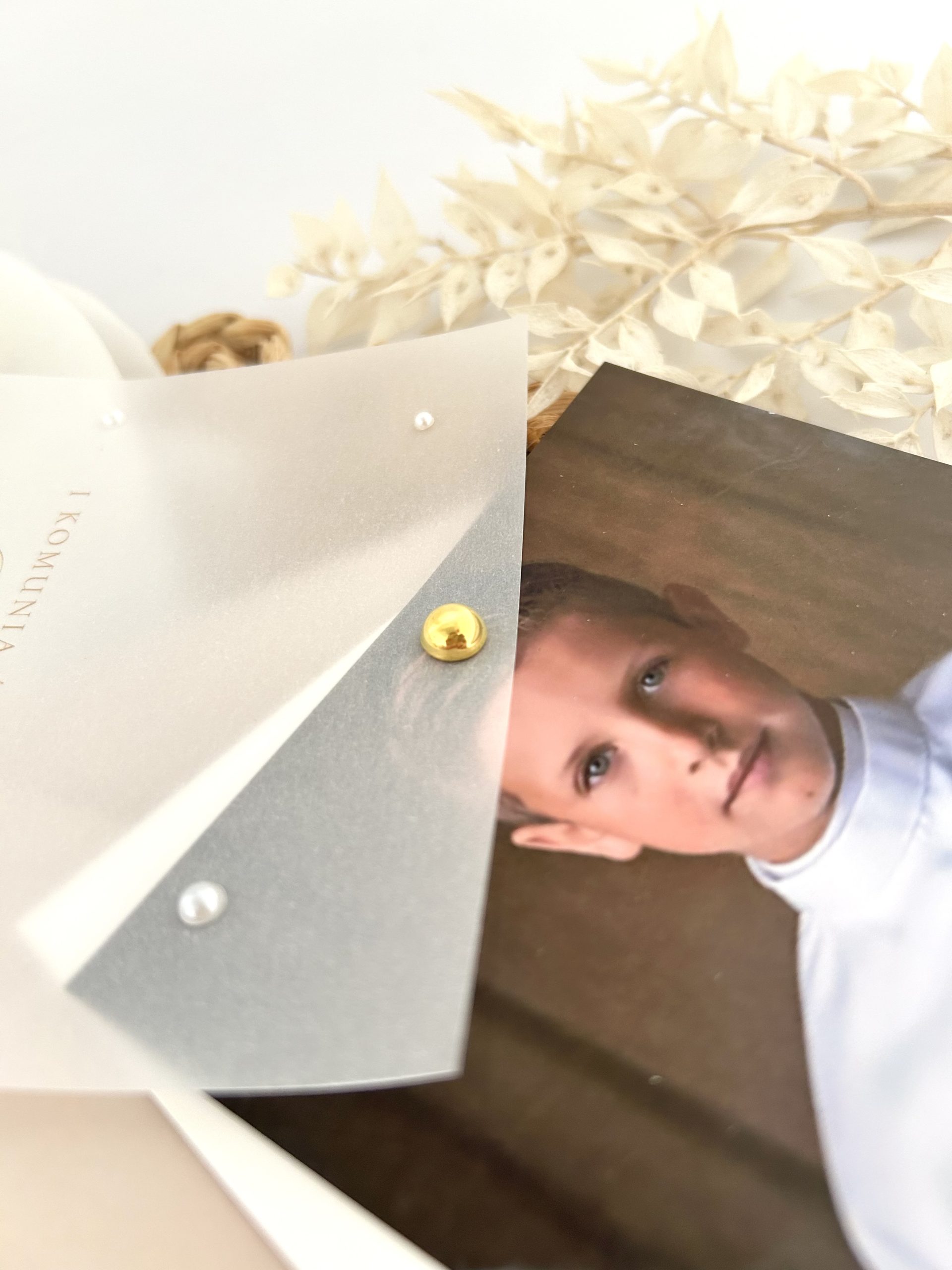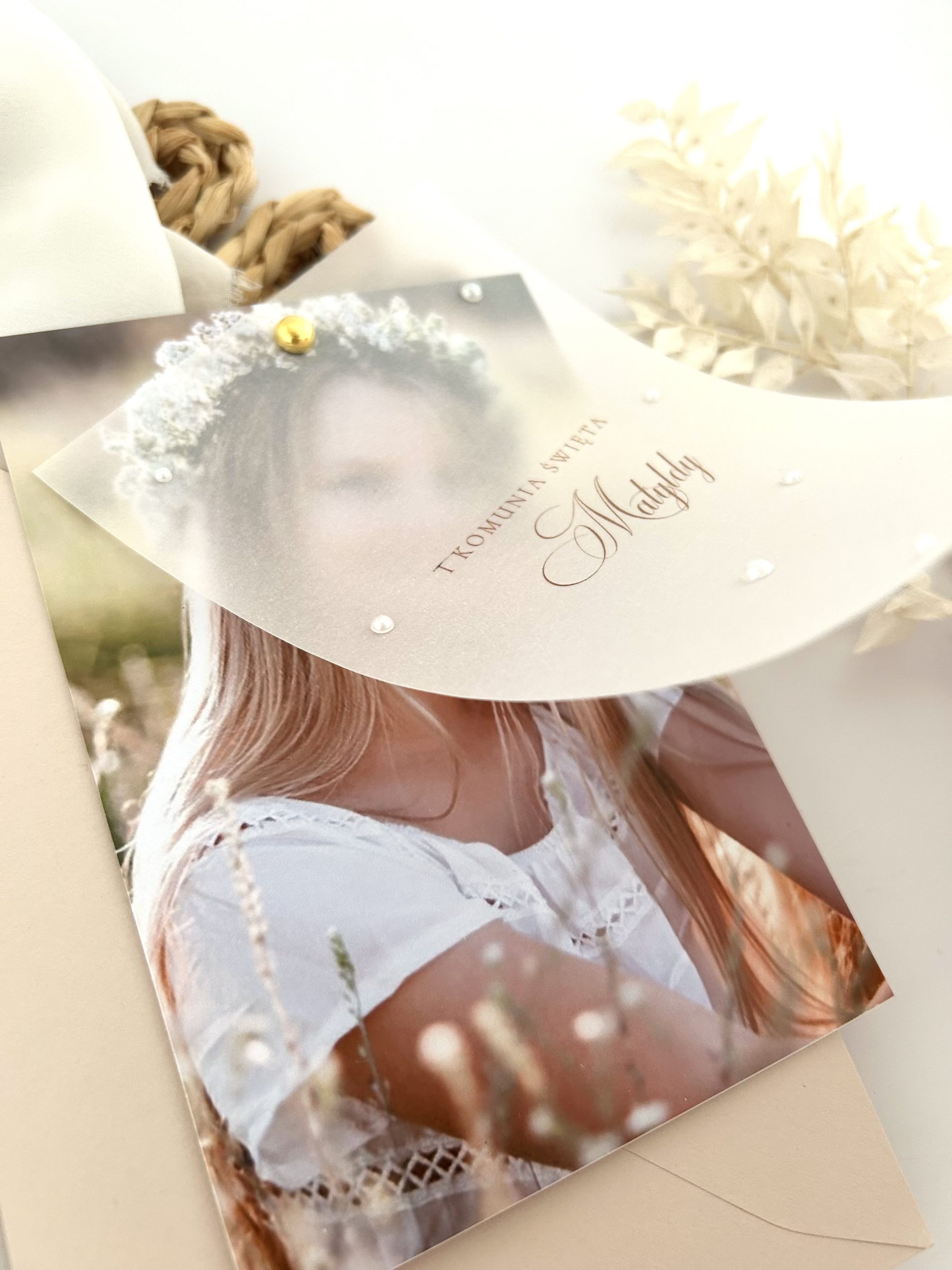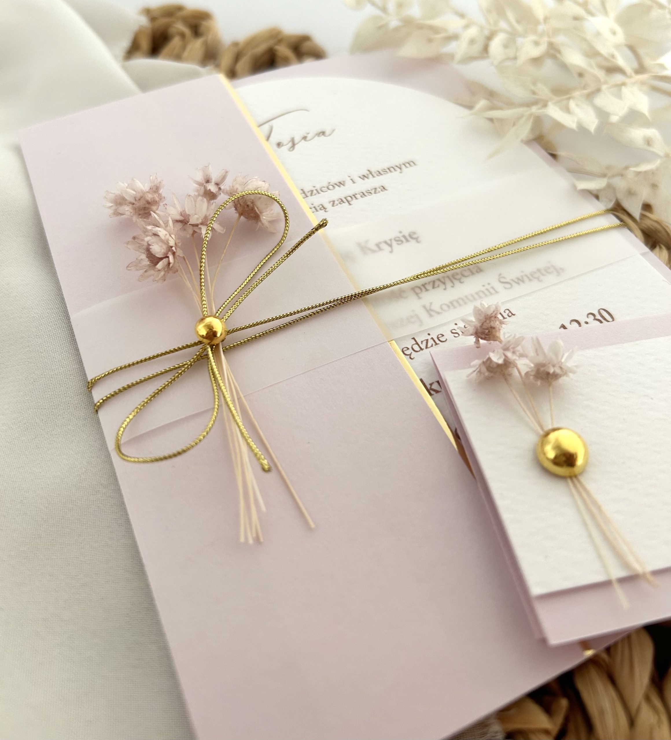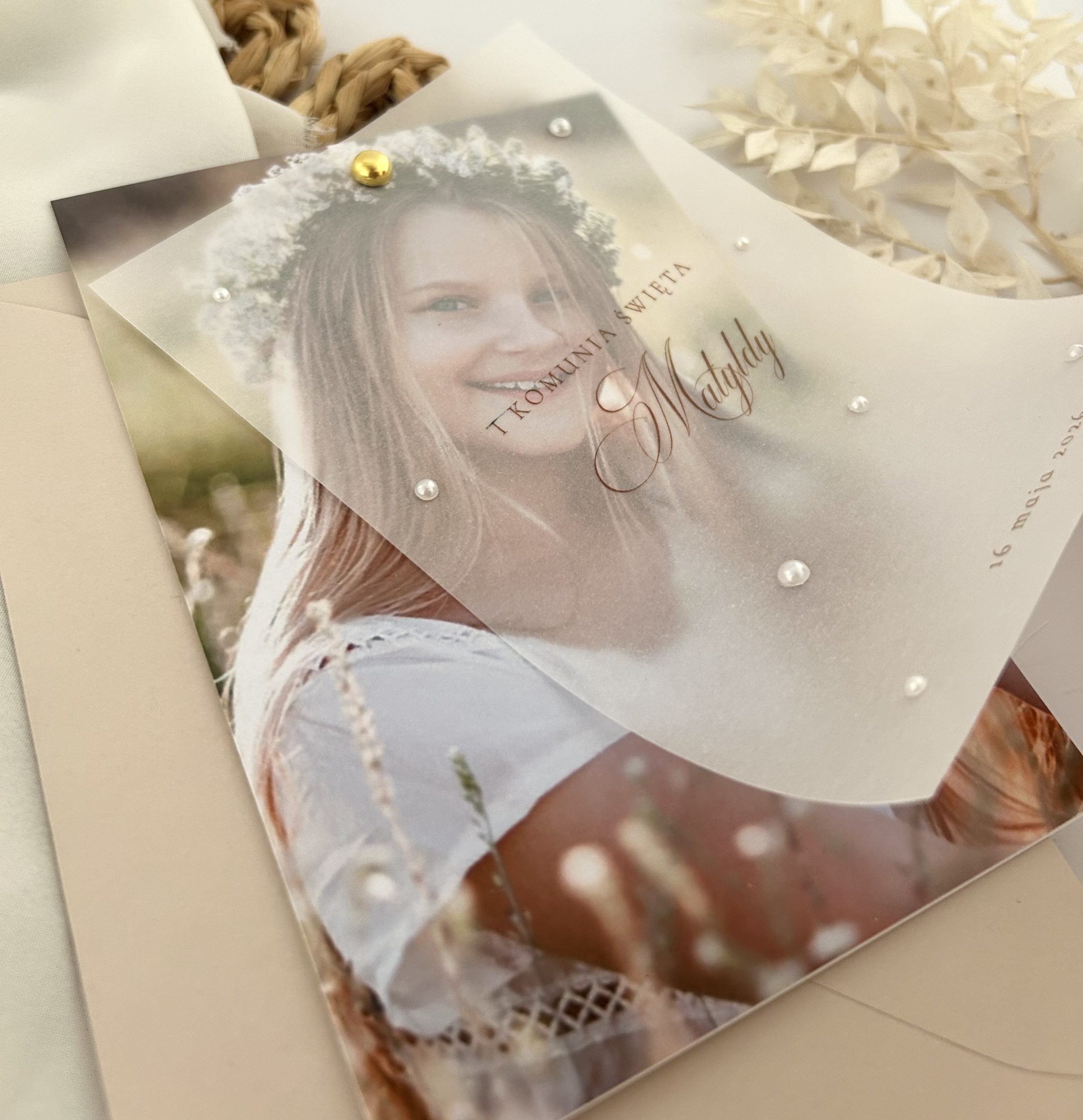 Dodatkowo kalka ze złotym sznurkiem i złotą perełką.