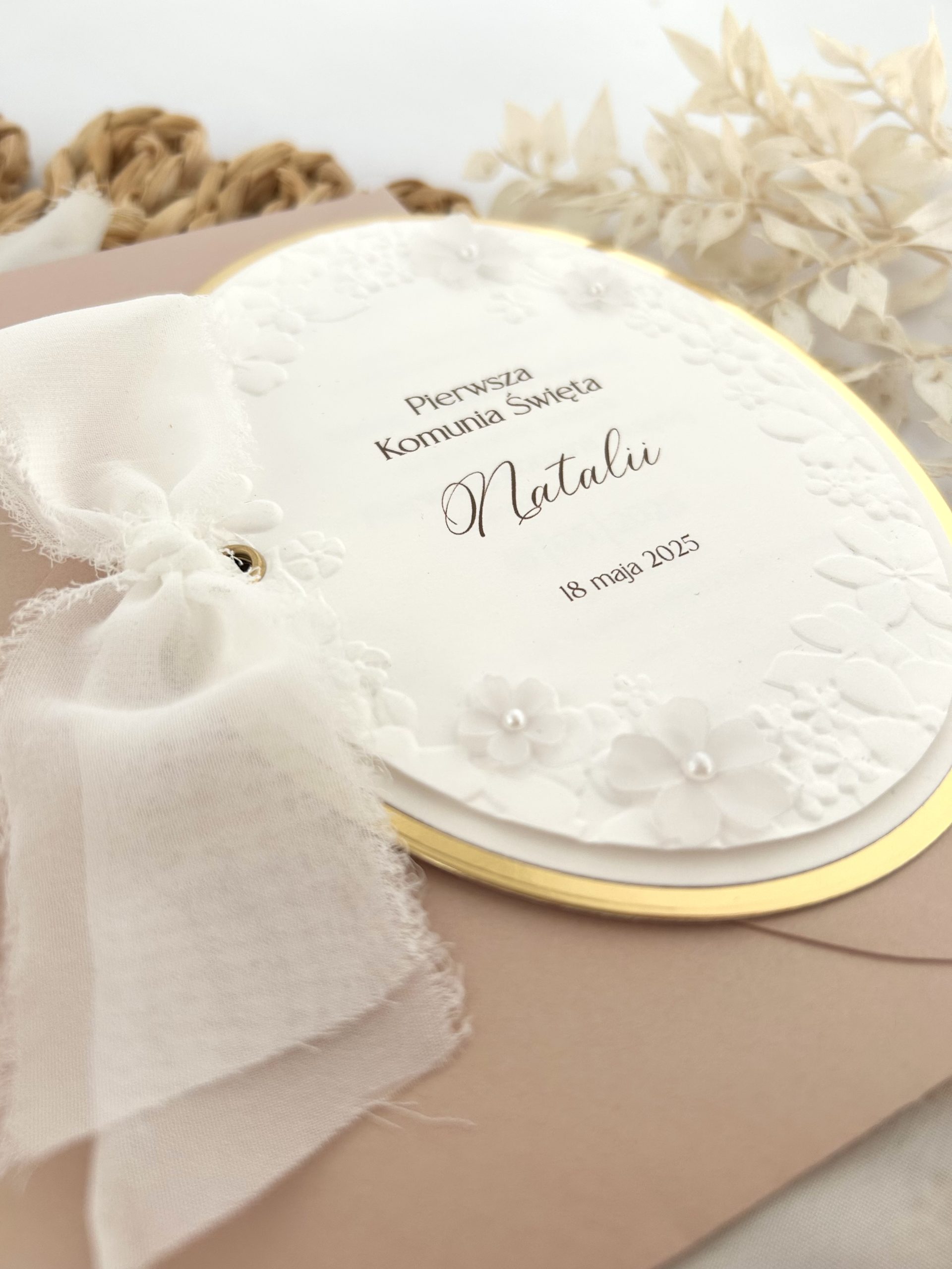 Tłoczenie, dekoracyjne kwiatuszki i perełki wycinane ręcznie.