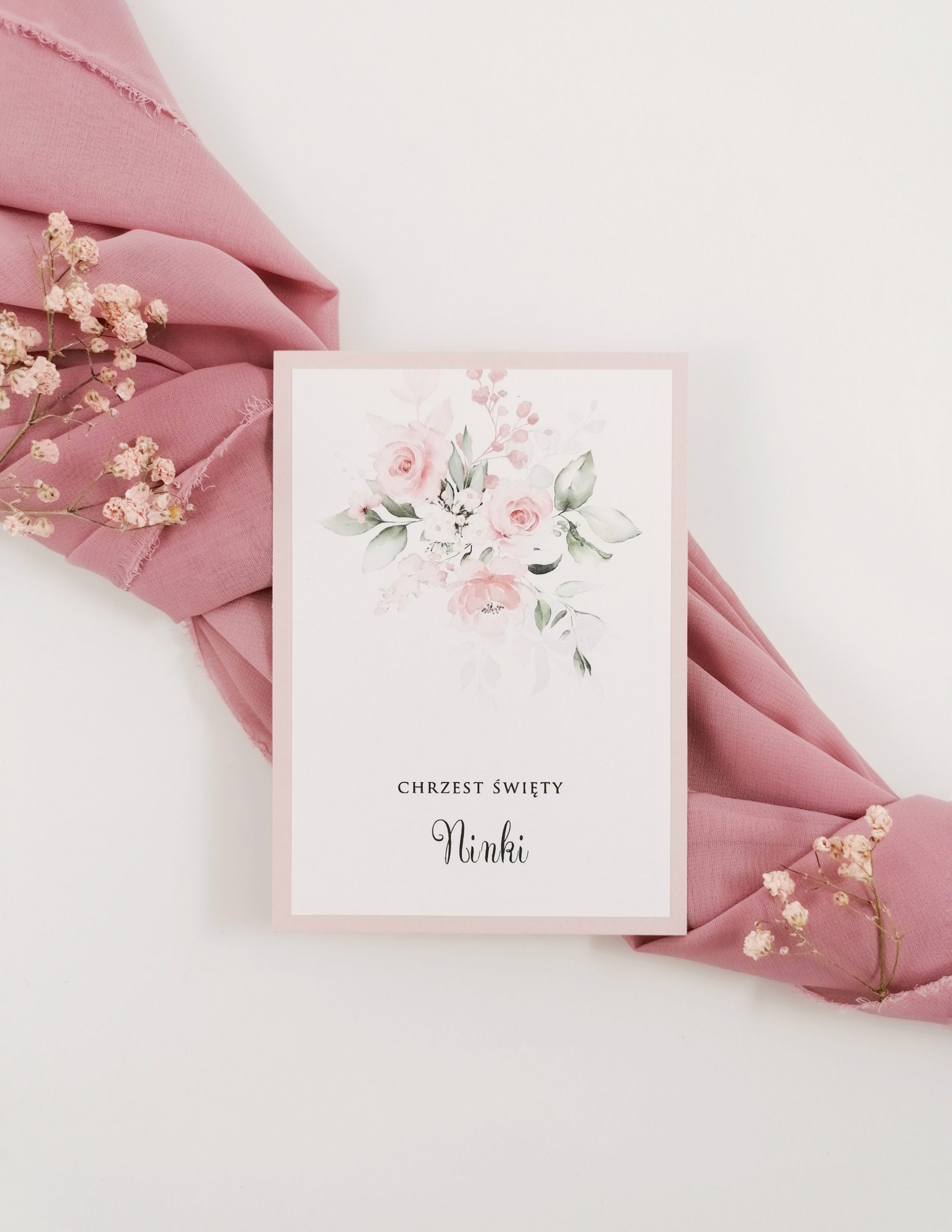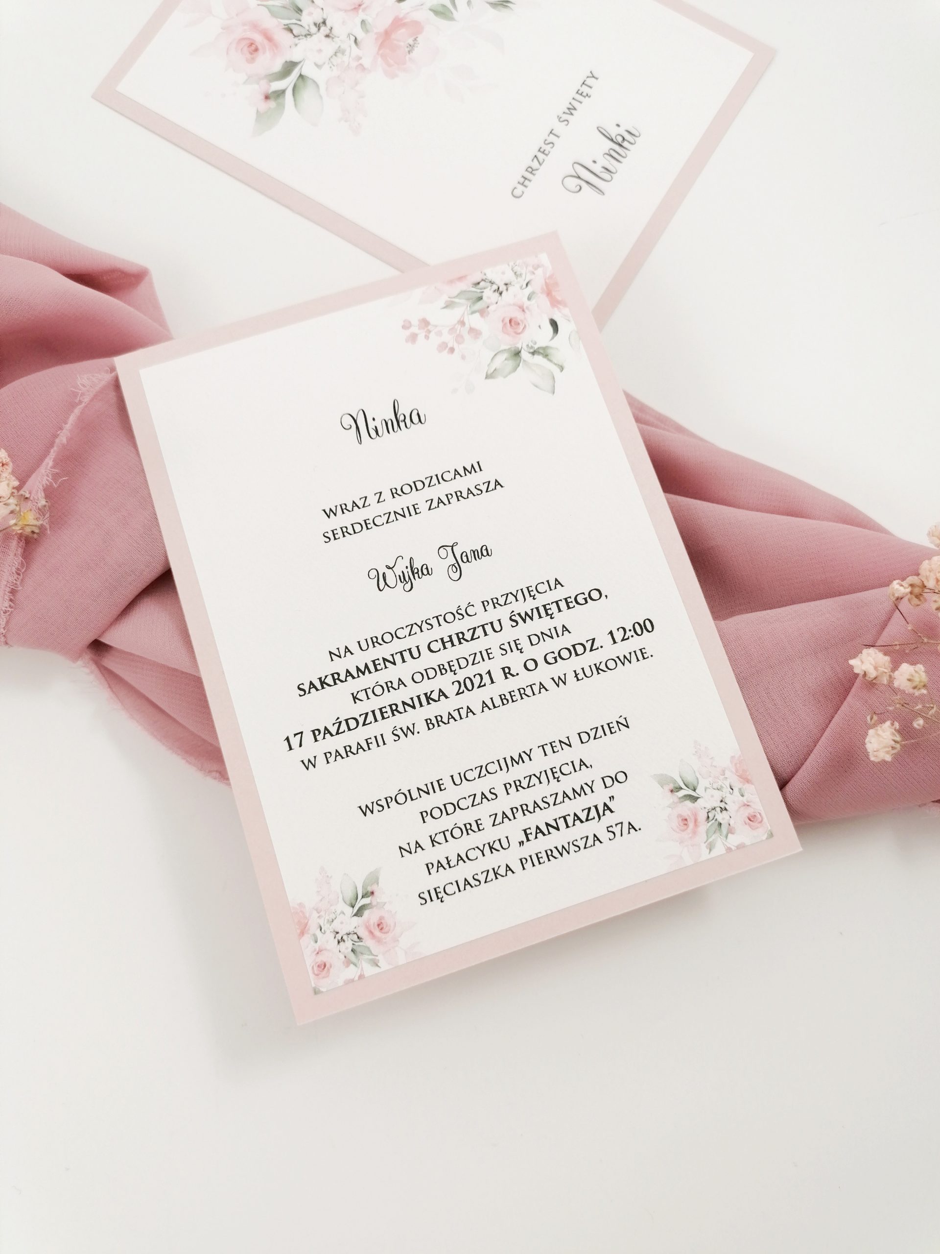 Zaproszenie składa się z 2 kart połączonych wstążką w kolorze białym/różowym, błękitnym lub sznurkiem.