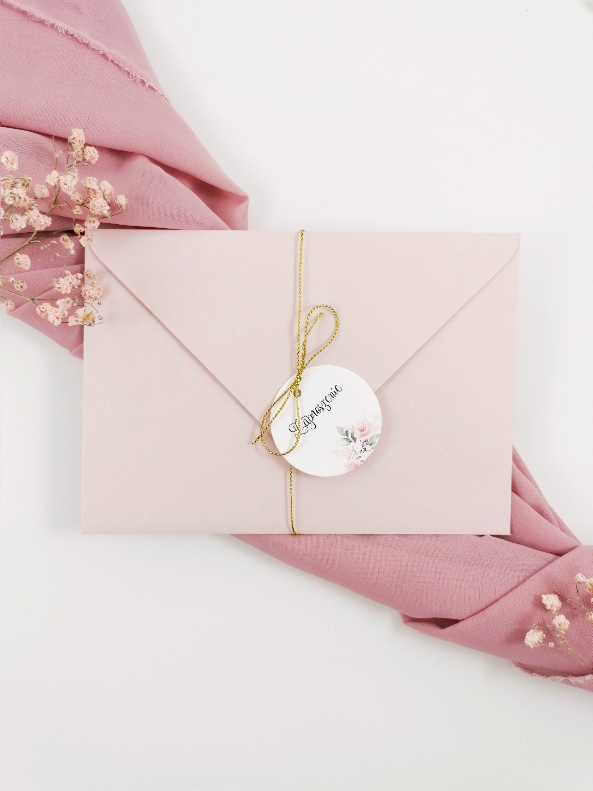 Koperta w kolorze jasnego różu, eko lub bieli z kółeczkiem z napisem oraz przewiązanie sznureczkiem.